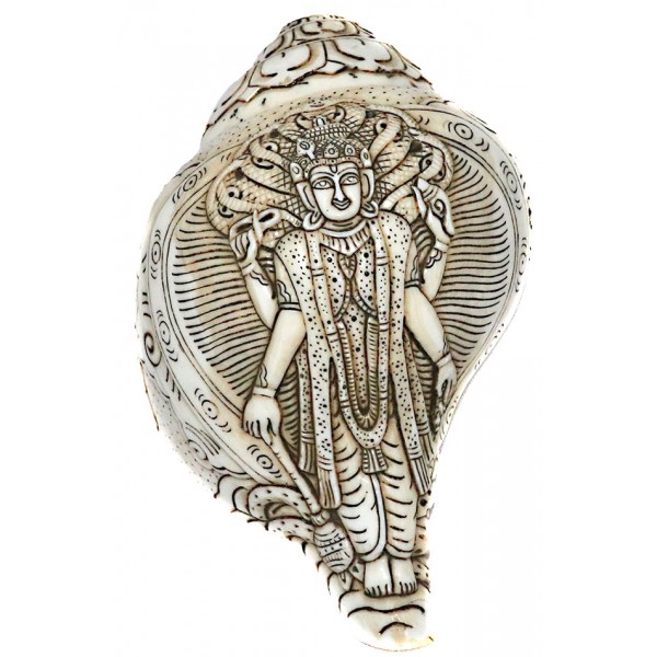 God Vishnu Carving Conch Shell (SANKHA), powerful ancient healing (therapeutic) instrument, Hand work, White Color - Medium Size